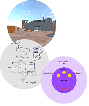 The world space is designed in a way that players can roam freely and explore the virtual space, getting accustomed to navigation. The warehouse space acts as the hub where players can choose to play any of the three planned games.