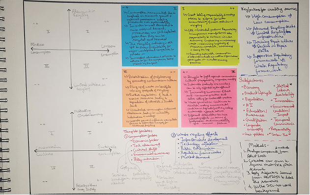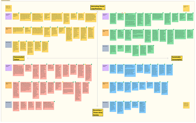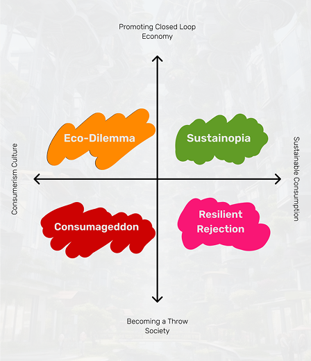 On the ends of X-axis lie 'Sustainable Consumption' and 'Consumerism', while on the Y-axis lie 'Promoting Closed Loop economies' and 'Becoming a Throwaway Society'. This helps me generate four scenarios that have their own twist that is based on situations or trends that can become reality as we trend down those paths.
